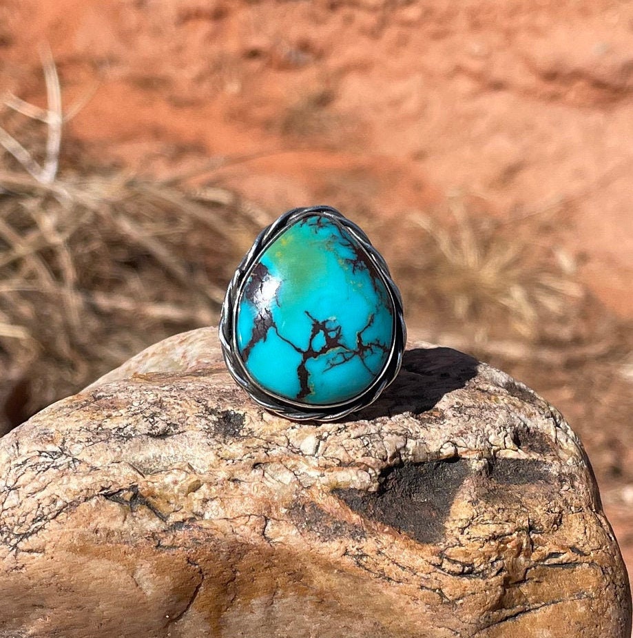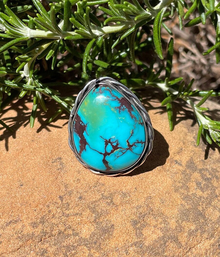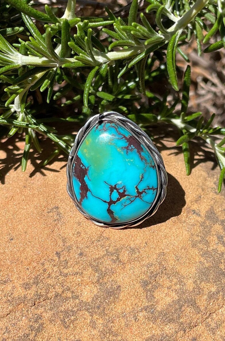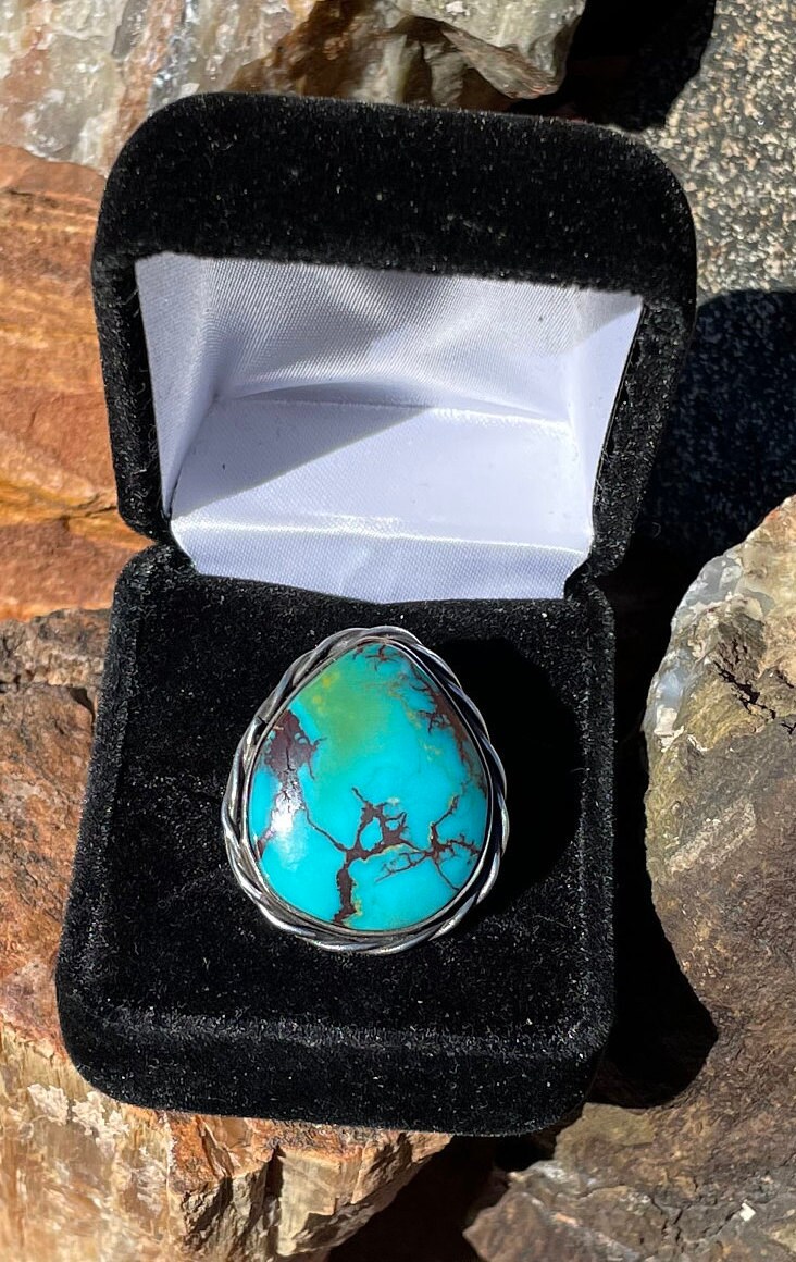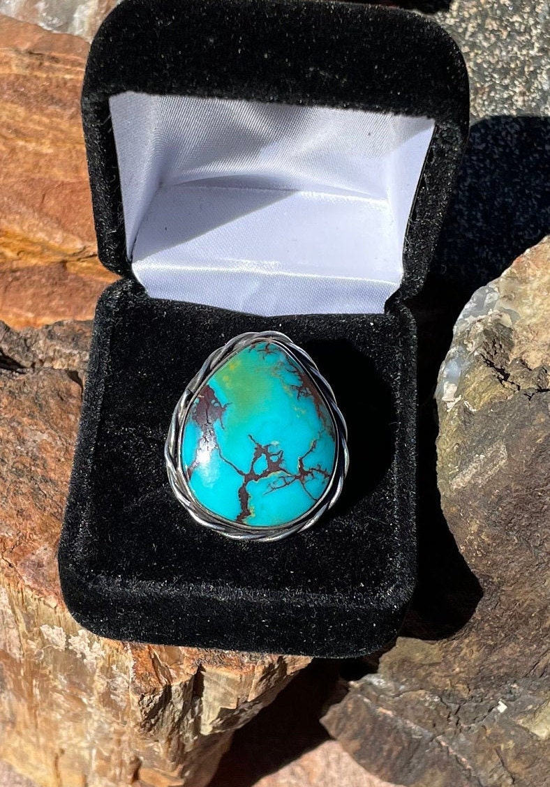 This large Polychrome Turquoise Gemstone is from Kingman Arizona. It is made with Sterling Silver 925. It has decorative sterling silver twist wire around entire gemstone, and a Sterling Silver decorative ring band.