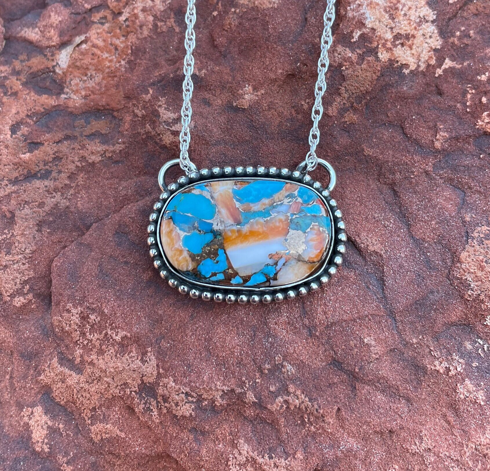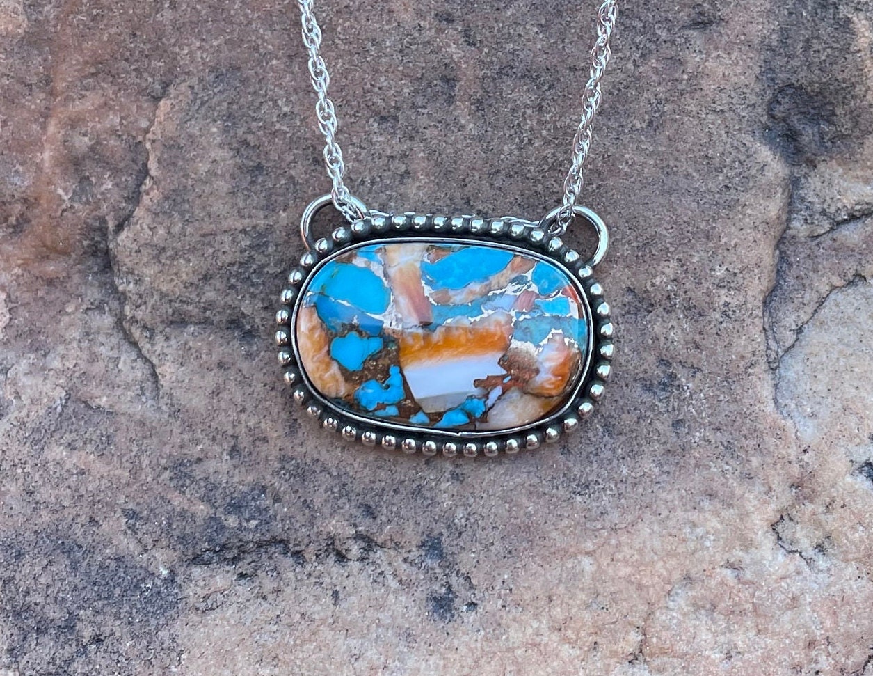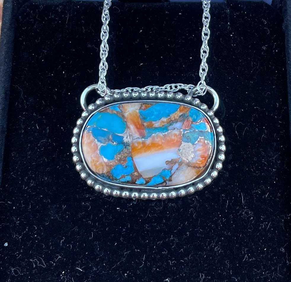This Pendant is made with Mohave Blue Kingman Turquoise, Spiny Oyster and bronze, and set in all Sterling Silver 925, it has decorative Sterling Silver balls around Gemstone. It has a rich applied patina. The Turquoise gemstone is Blue with Spiny Oyster and Bronze.
