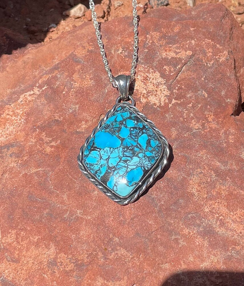 This Pendant is made with Mohave Blue Kingman Turquoise and set in all Sterling Silver 925, it has decorative Sterling Silver twist wire around Gemstone. It has a rich applied patina. The Turquoise gemstone is Blue and Black.