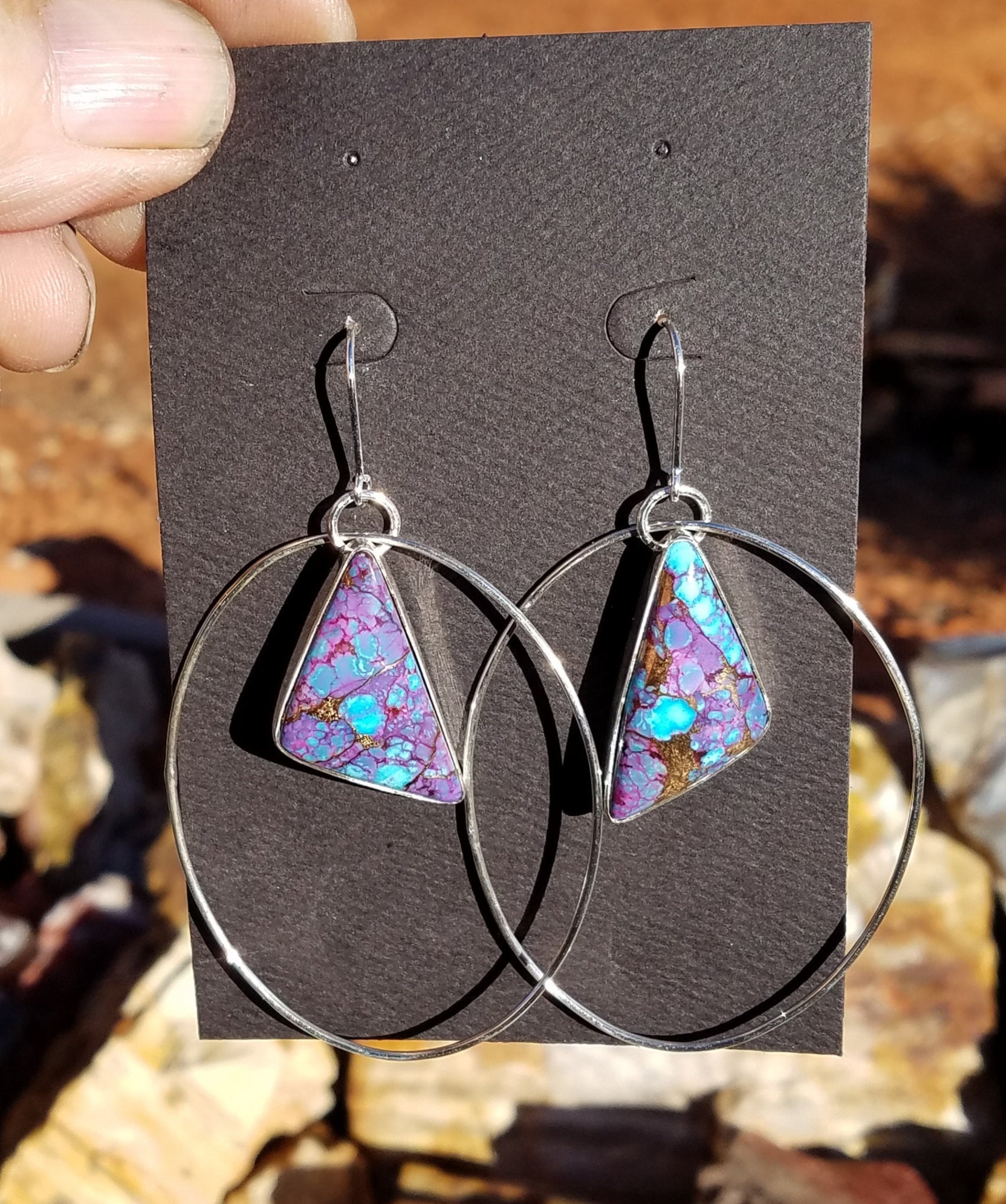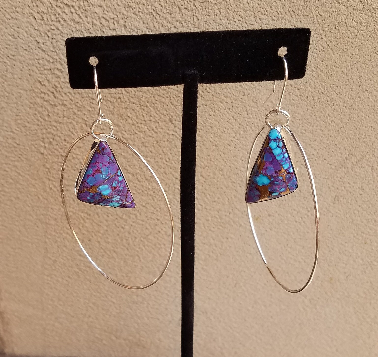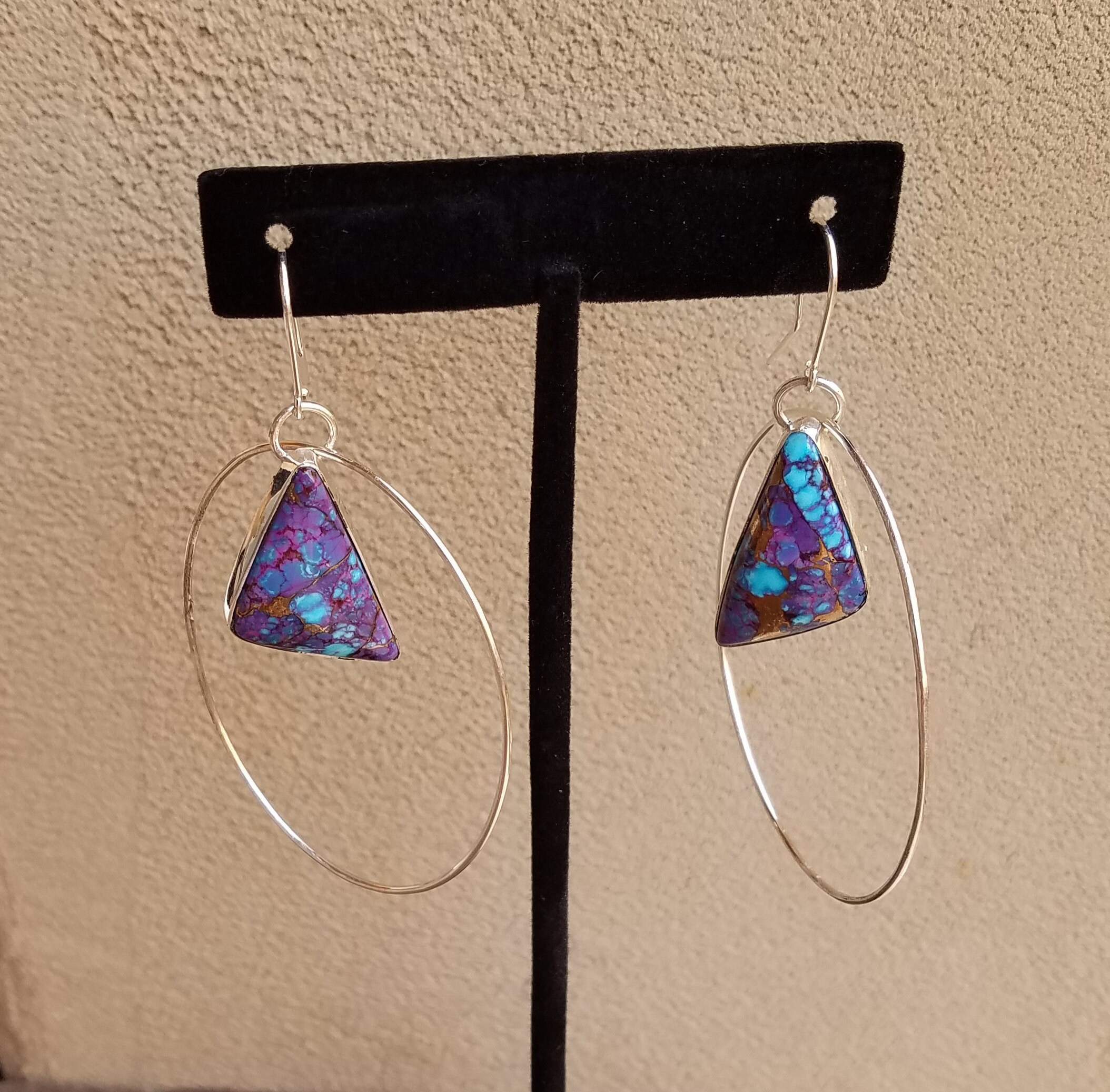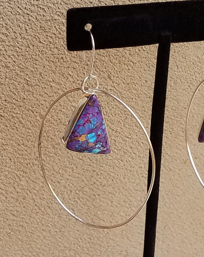 Ear post have a 15mm drop and attached to a 55mm long hoop with the Turquoise dangling 30mm in the center of the hoop. These are a light weight earring set.