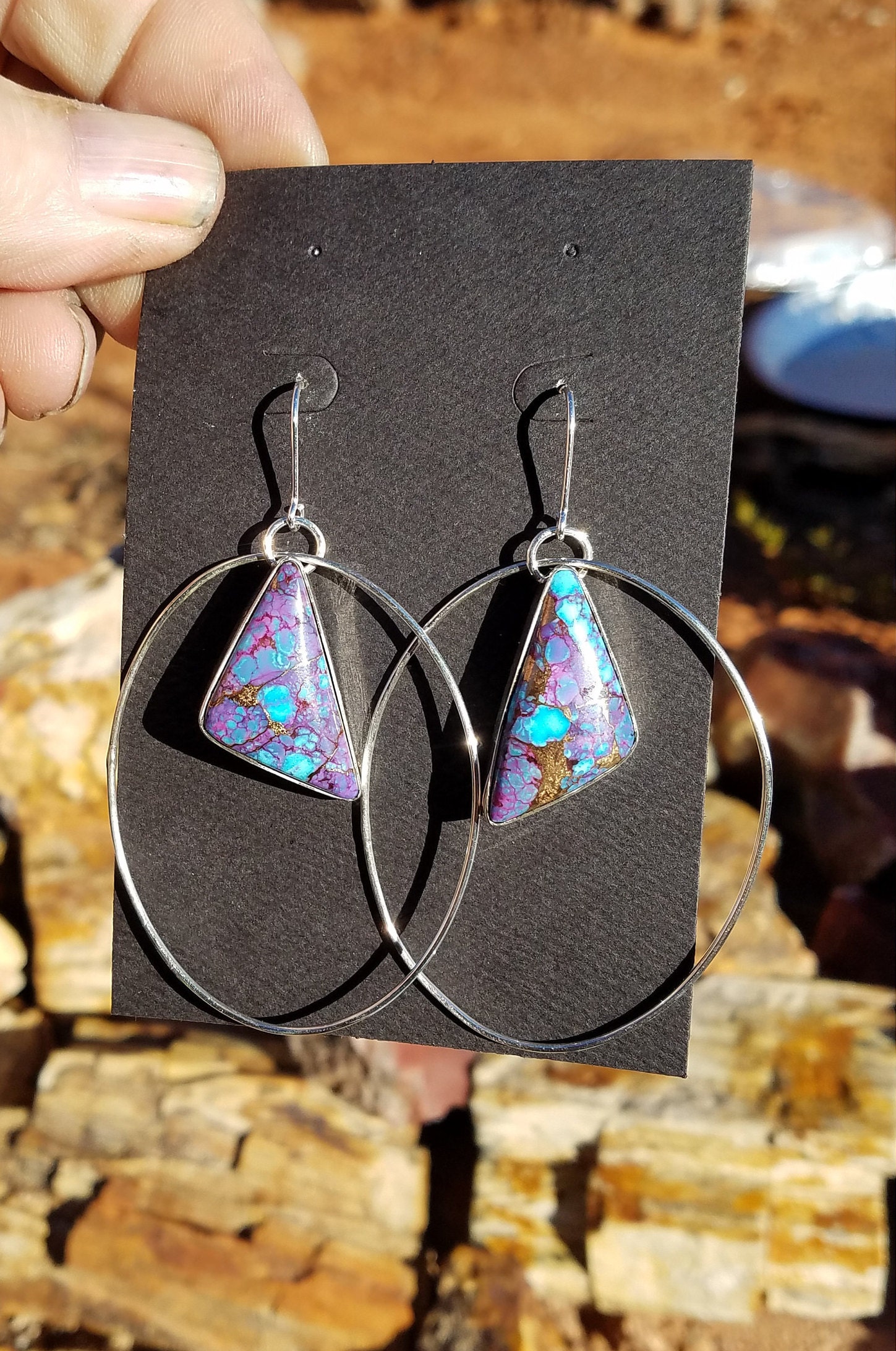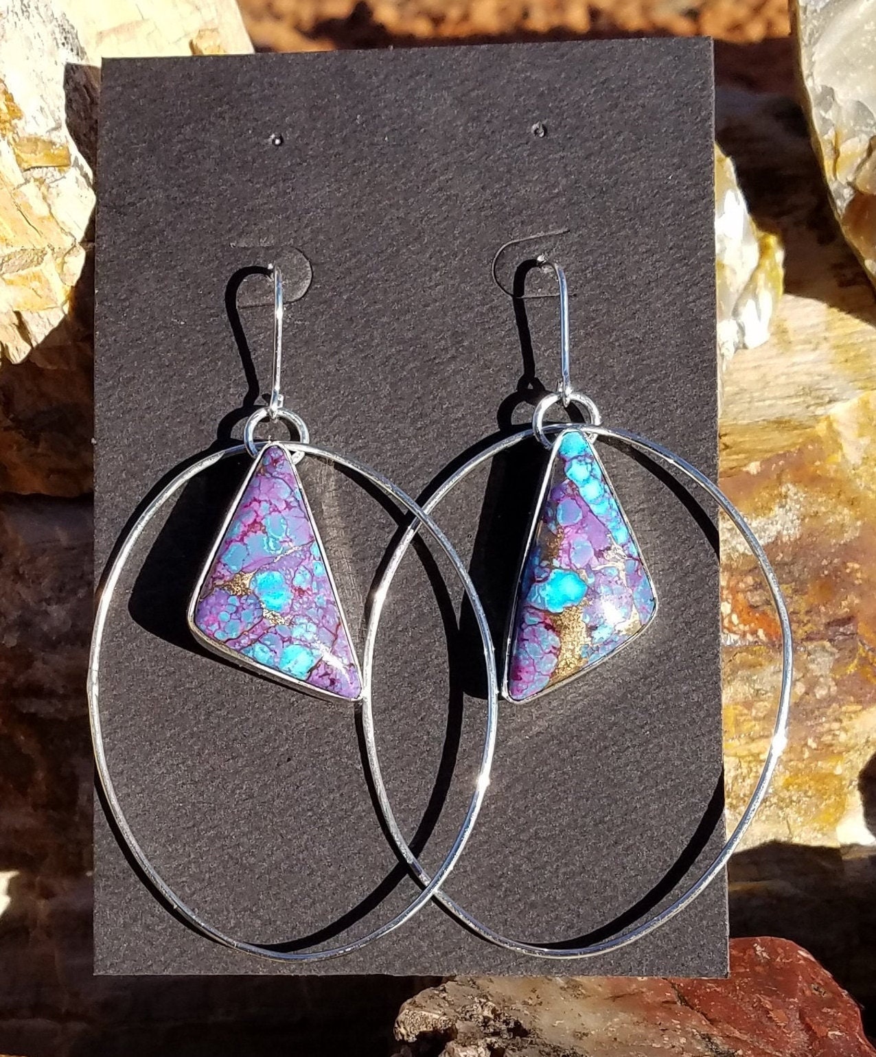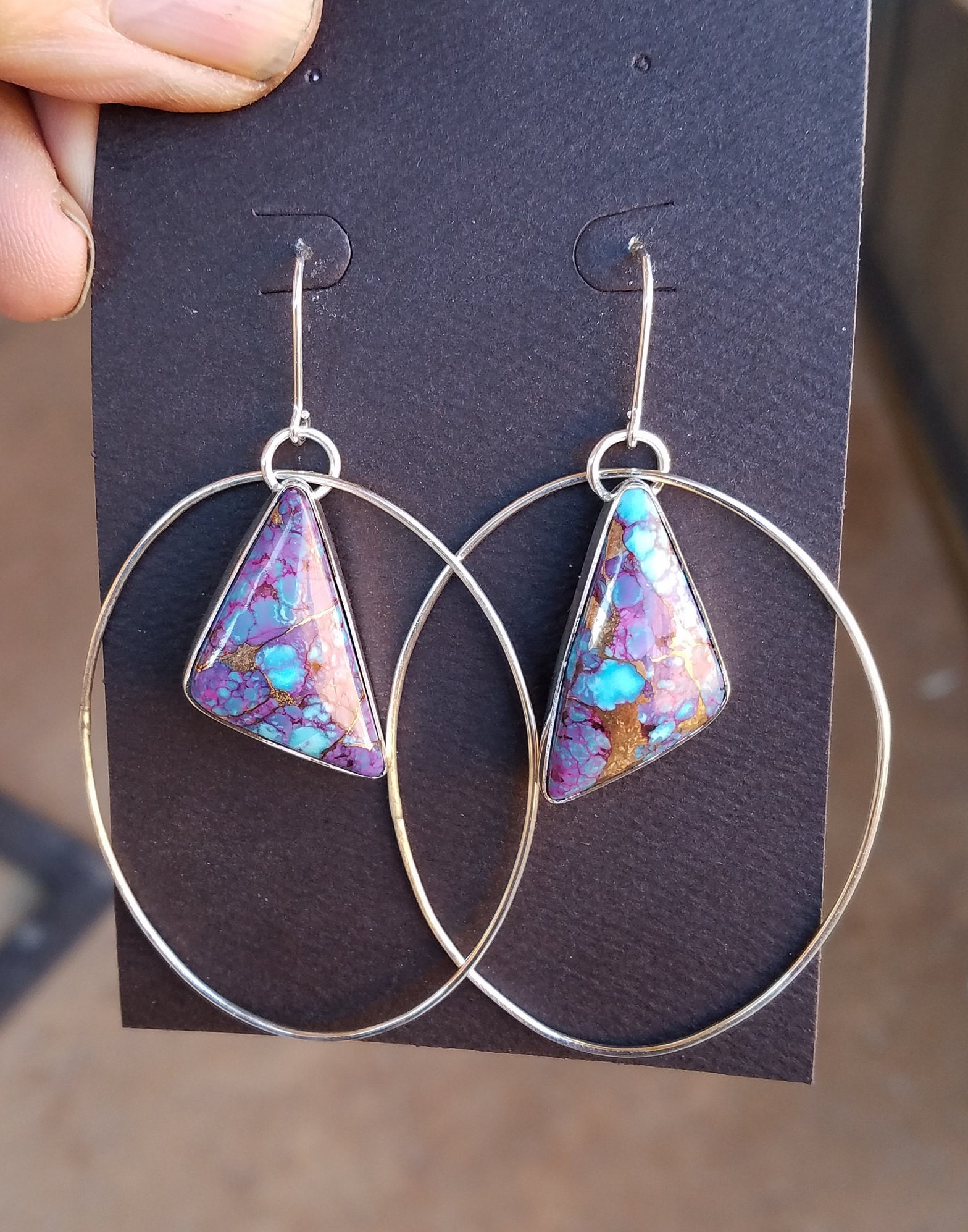 Ear post have a 15mm drop and attached to a 55mm long hoop with the Turquoise dangling 30mm in the center of the hoop. These are a light weight earring set.