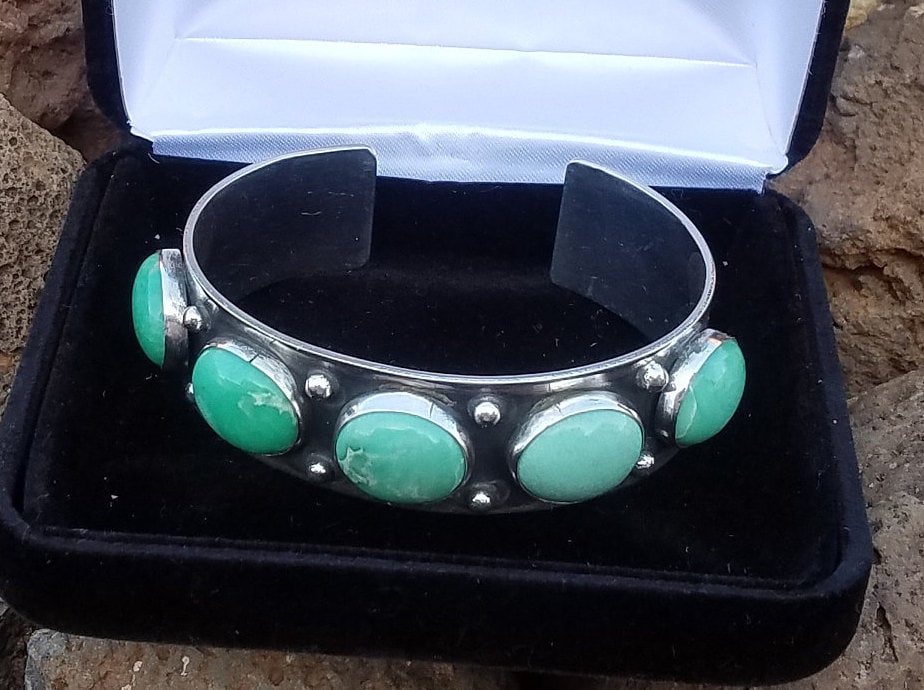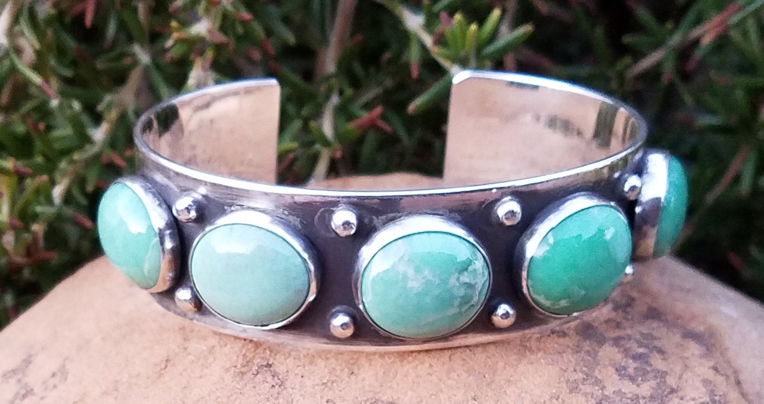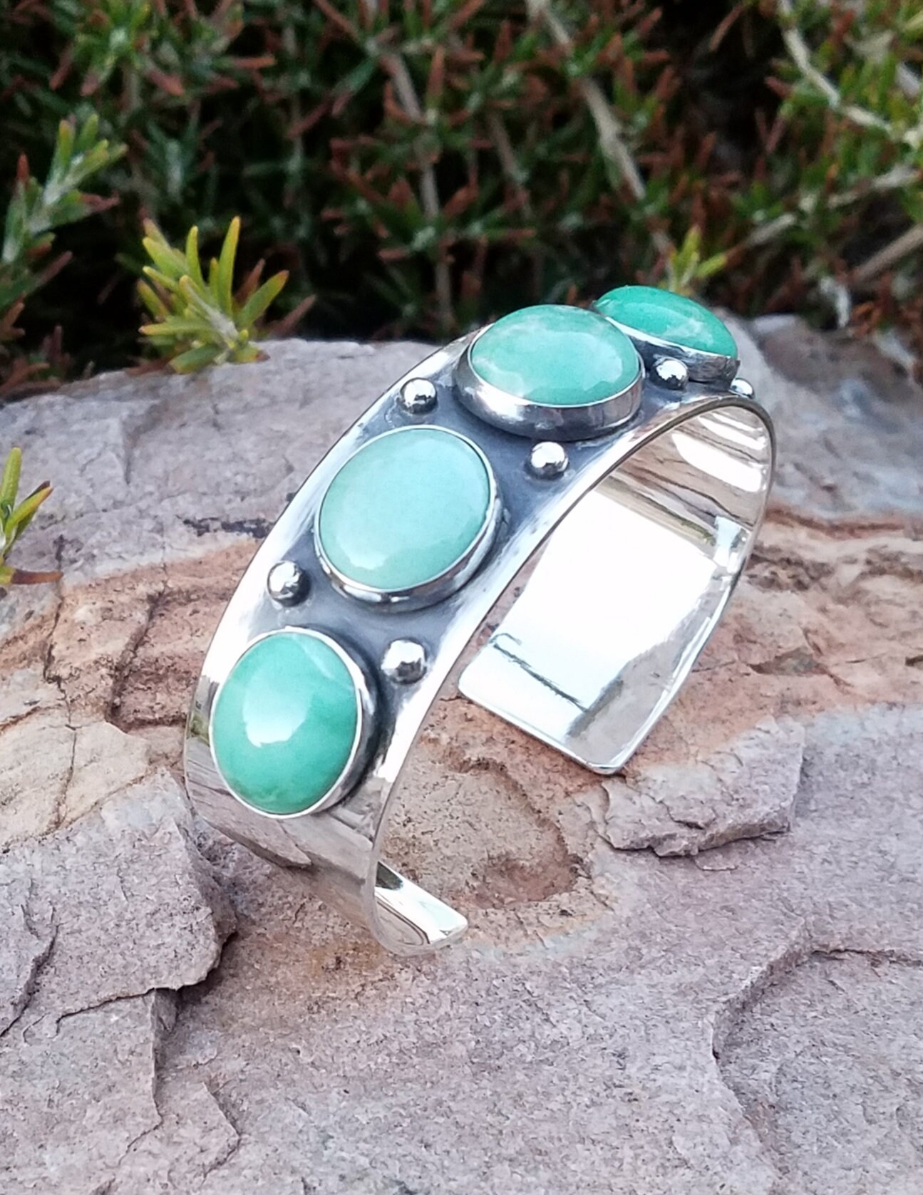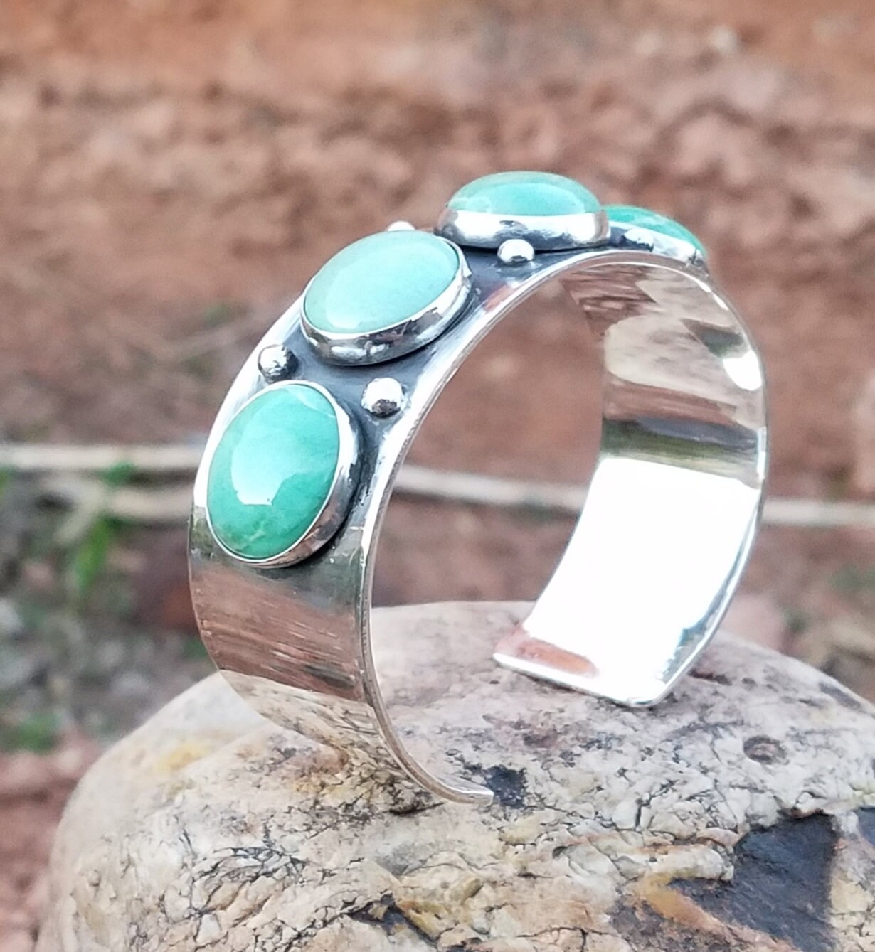 This cuff bracelet has fivel oval hand shaped Utah Variscite Gemstones and made with all Sterling Silver 925. This is a Beautiful cuff bracelet that can be worn and enjoyed for years to come, and it would make a wonderful gift for yourself or anyone who loves natural Variscite and Sterling Silver!