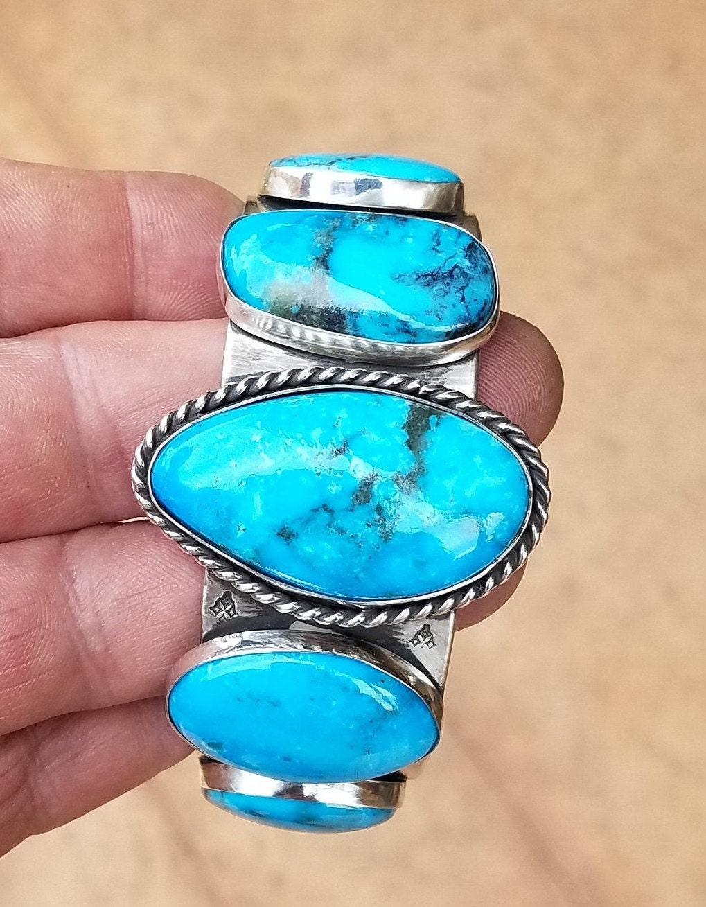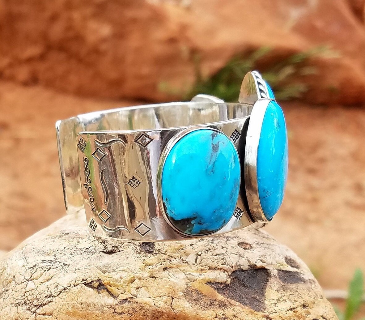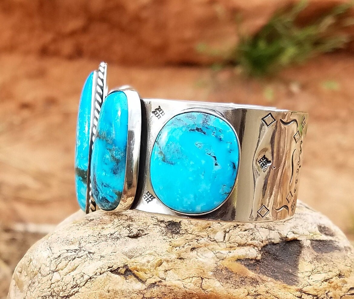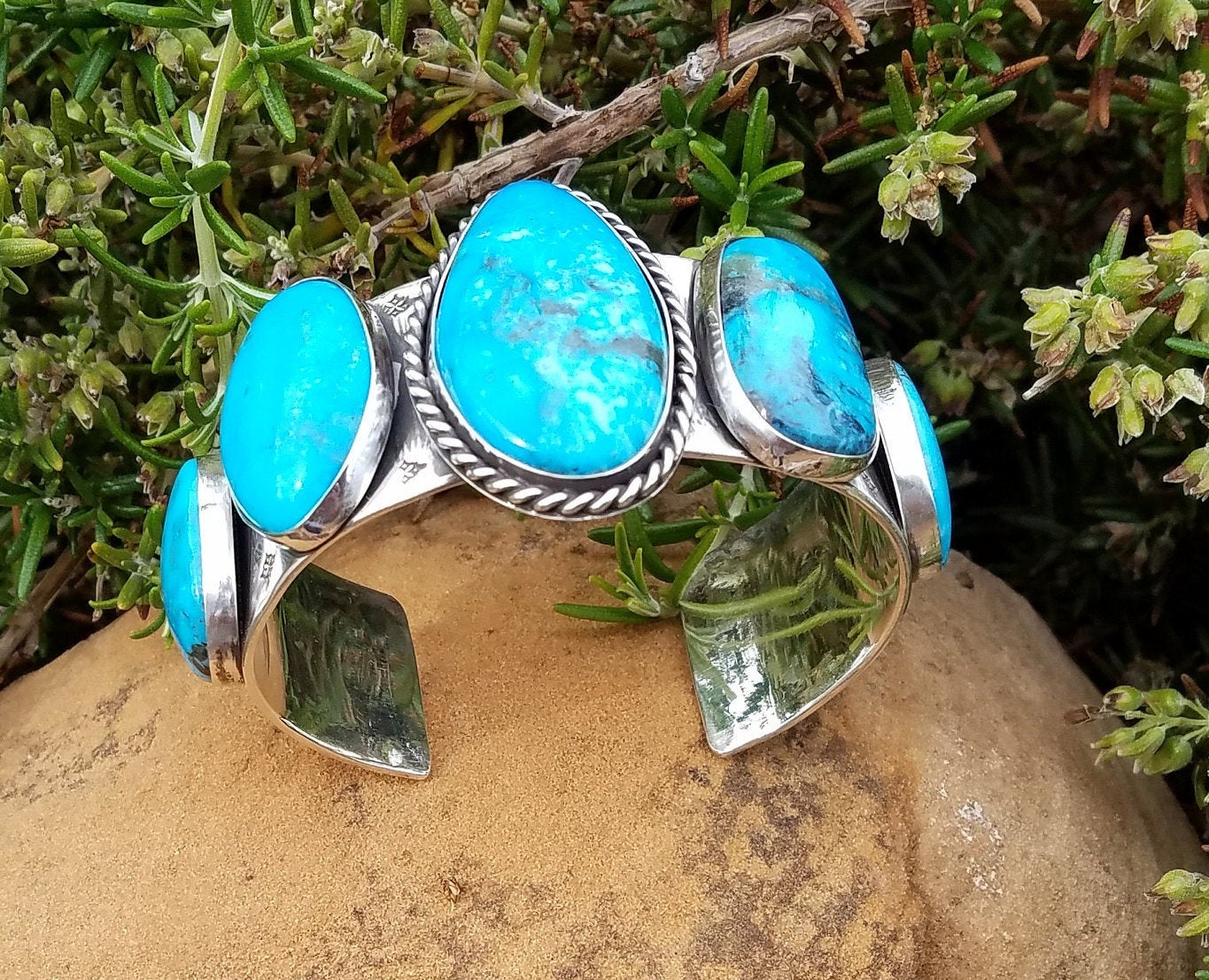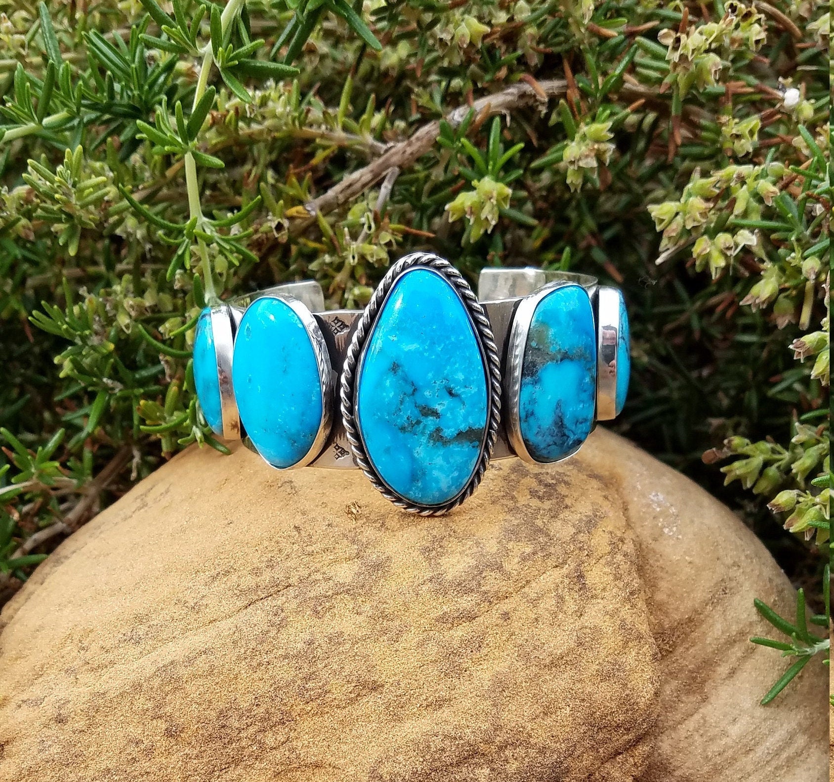 This cuff bracelet has five free form hand shaped blue Kingman Turquoise Gemstones and made with all Sterling Silver 925. The band has been hand stamped and it has a rich applied patina. The Cuff band is 1"wide and measures 6" end to end. It is adjustable with slight pressure. It is shaped to fit a 7" wrist. Total weight 95 grams.