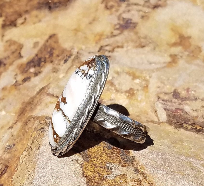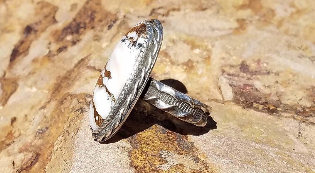 This ring is made with White Buffalo Turquoise from Kingman Arizona, and set in all Sterling Silver 925. This is a Beautiful ring that can be worn and enjoyed for years to come, and it would make a wonderful gift for yourself or anyone who loves White Buffalo and Sterling Silver!