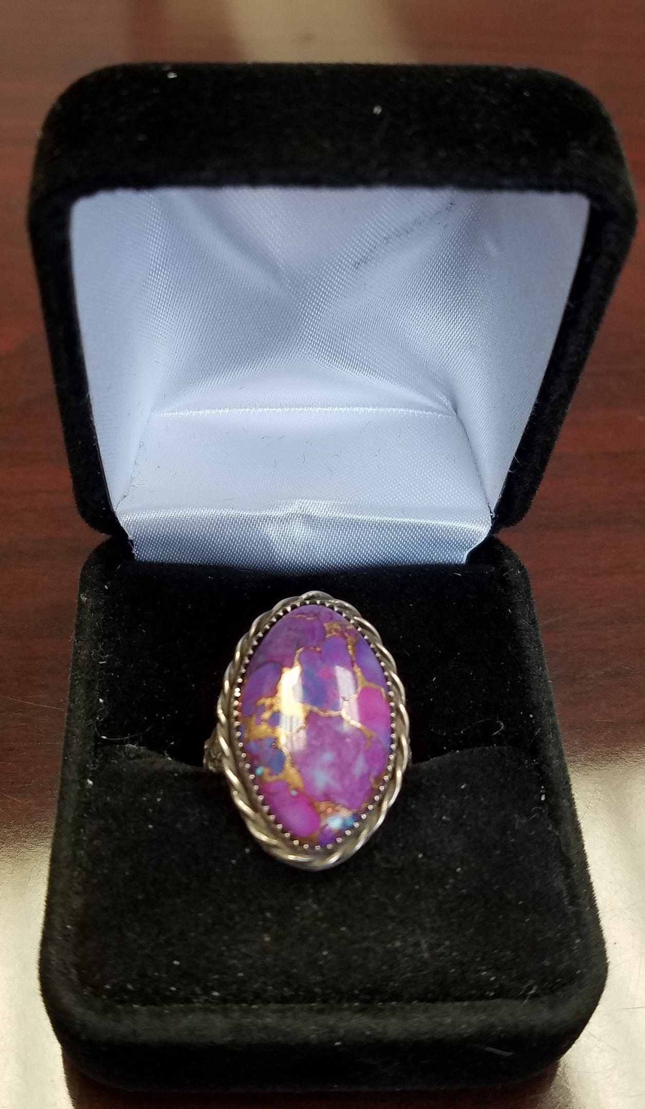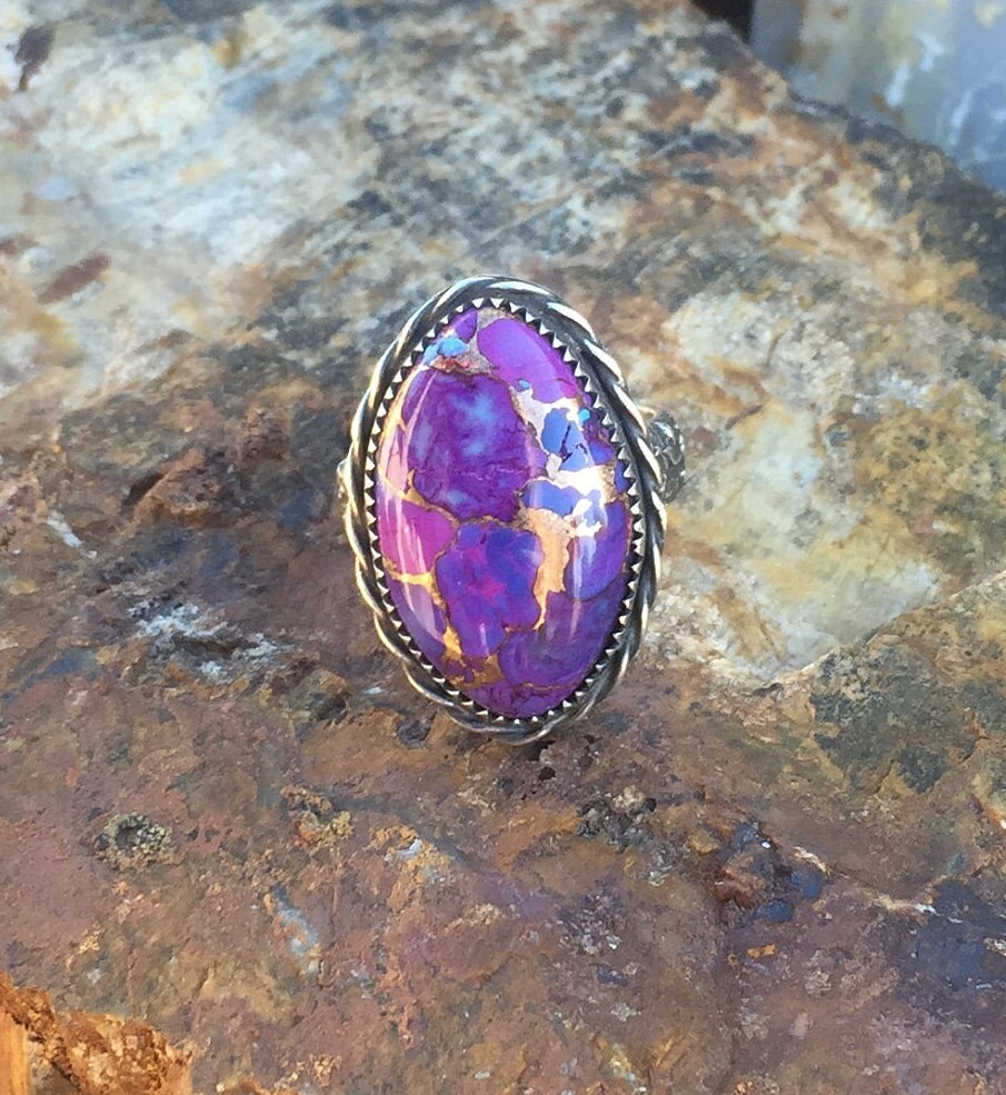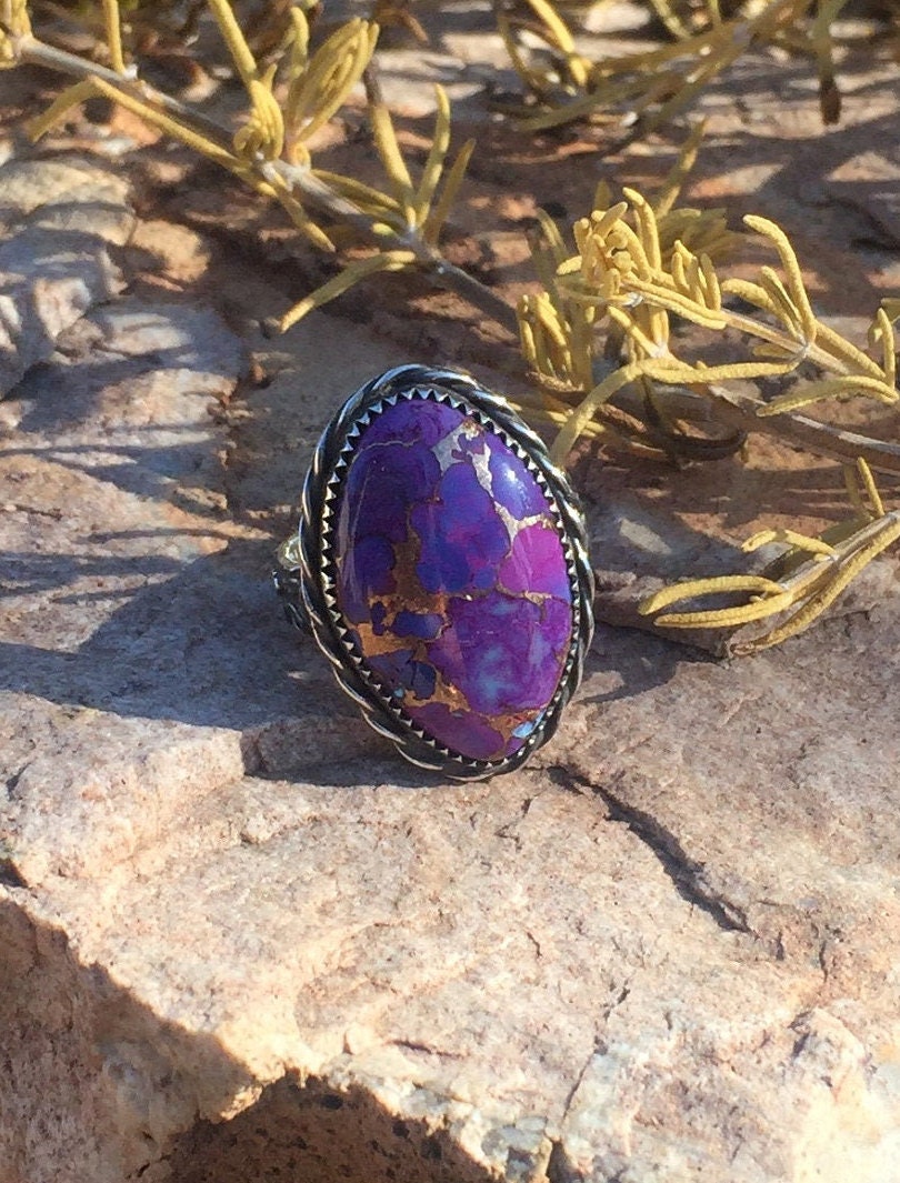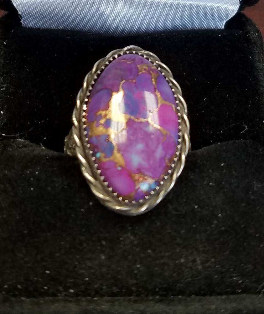 This ring is made with Mohave Turquoise gemstone from Kingman Arizona, and set in all Sterling Silver 925. It is set in a serrated bezel with decorative twist wire. The gemstone measure 24X14mm. Ring band is 5mm wide with a decorative stamped band. It has a rich applied patina.