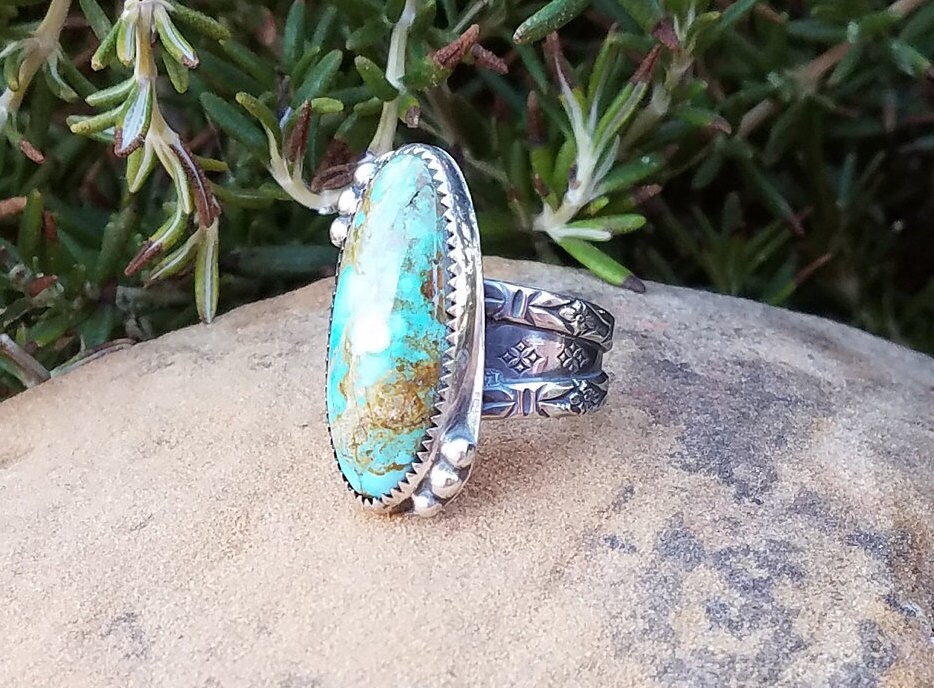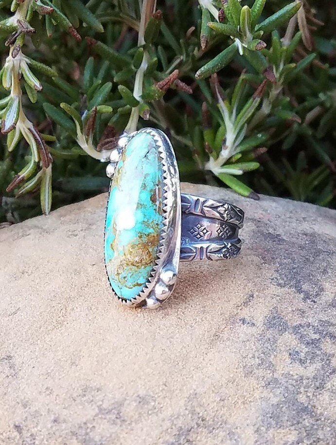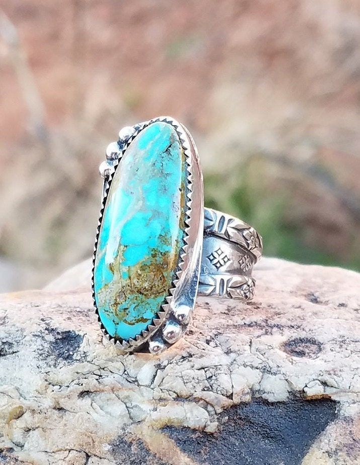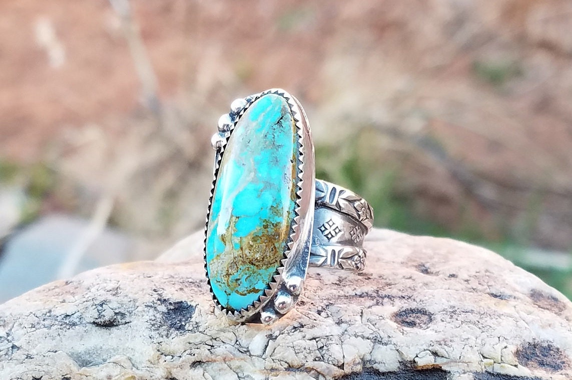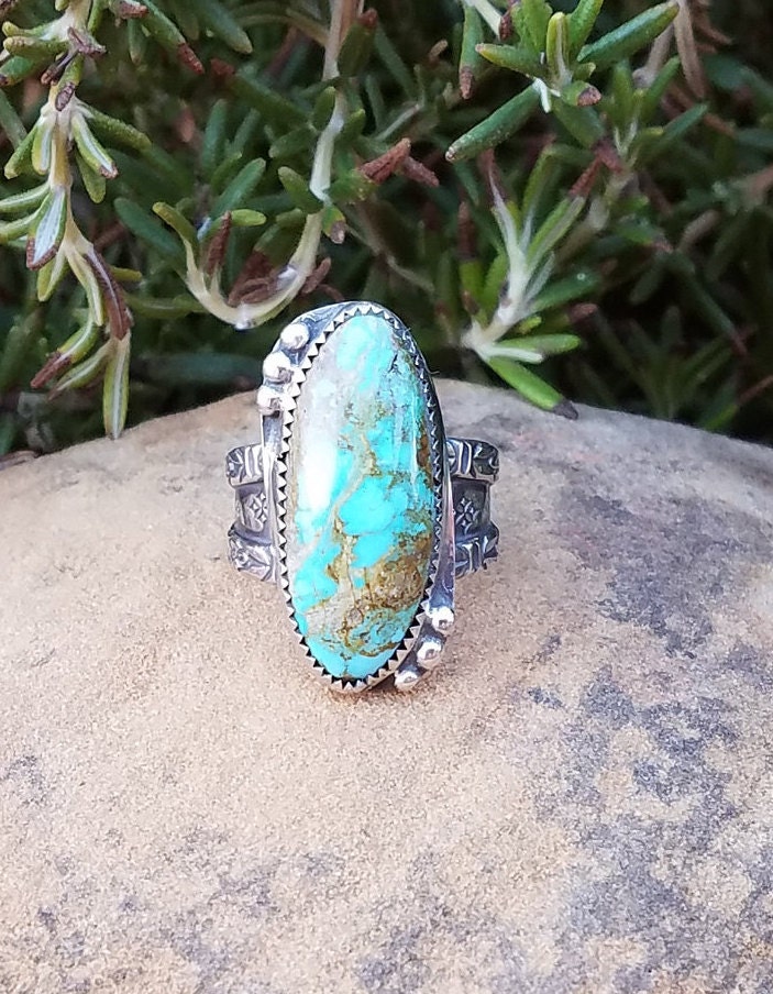 This Natural Green Kingman Turquoise Ring it is made with Sterling Silver 925. It has decorative sterling silver balls. and a decorative hand stamped Band. This is a high-quality ring that can be worn and enjoyed for years to come, and it would make a wonderful gift for anyone who loves Turquoise and Sterling Silver!