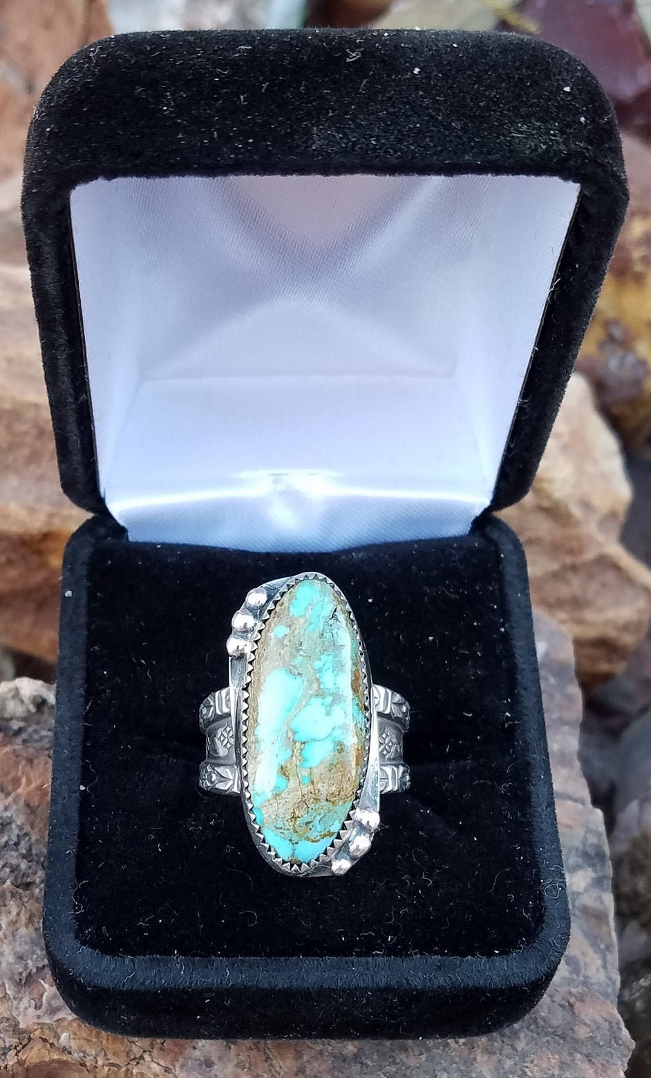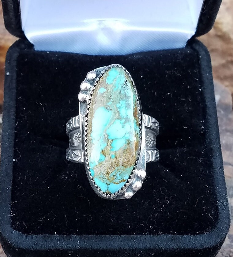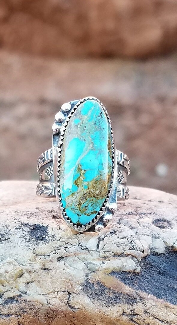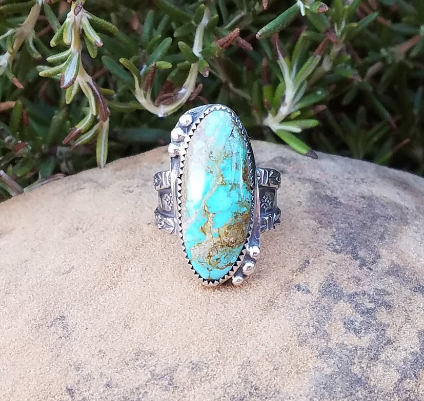 This Natural Green Kingman Turquoise Ring it is made with Sterling Silver 925. It has decorative sterling silver balls. and a decorative hand stamped Band. This is a high-quality ring that can be worn and enjoyed for years to come, and it would make a wonderful gift for anyone who loves Turquoise and Sterling Silver!