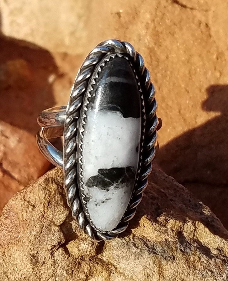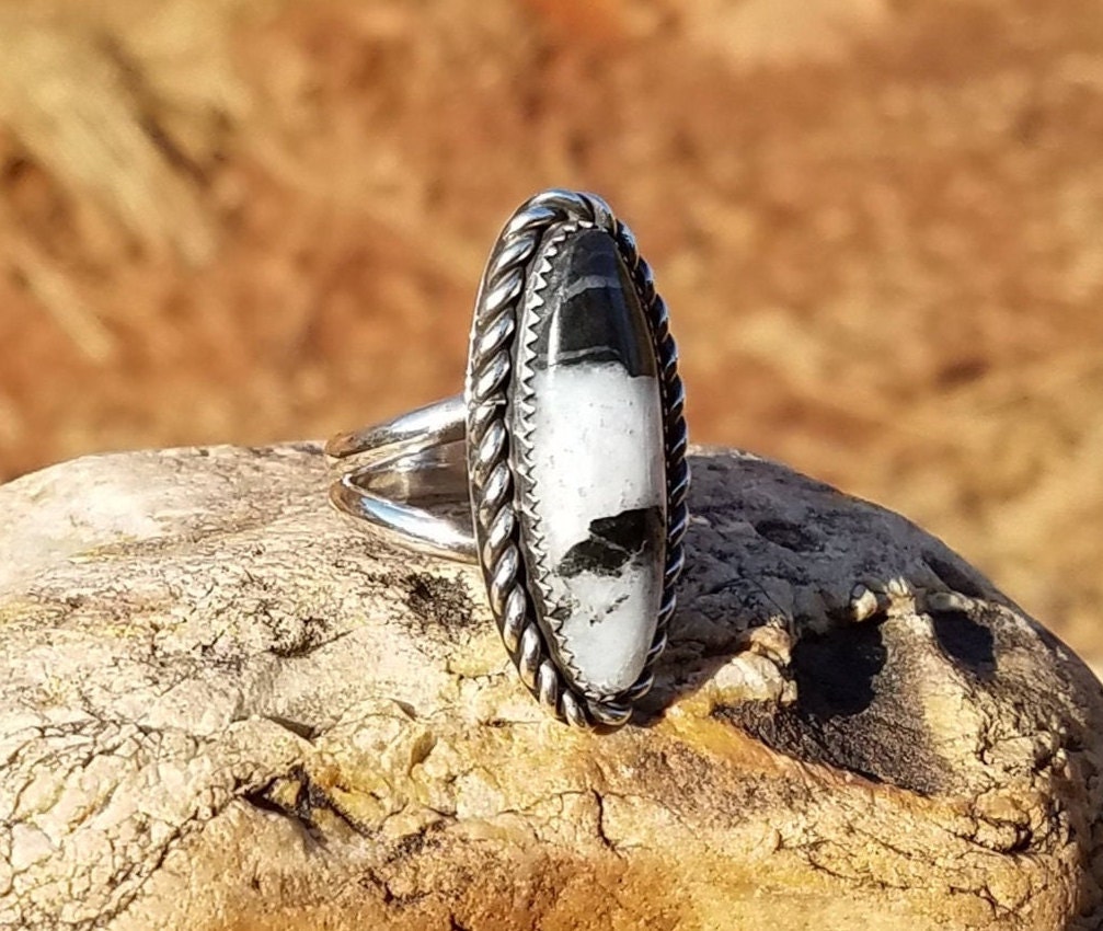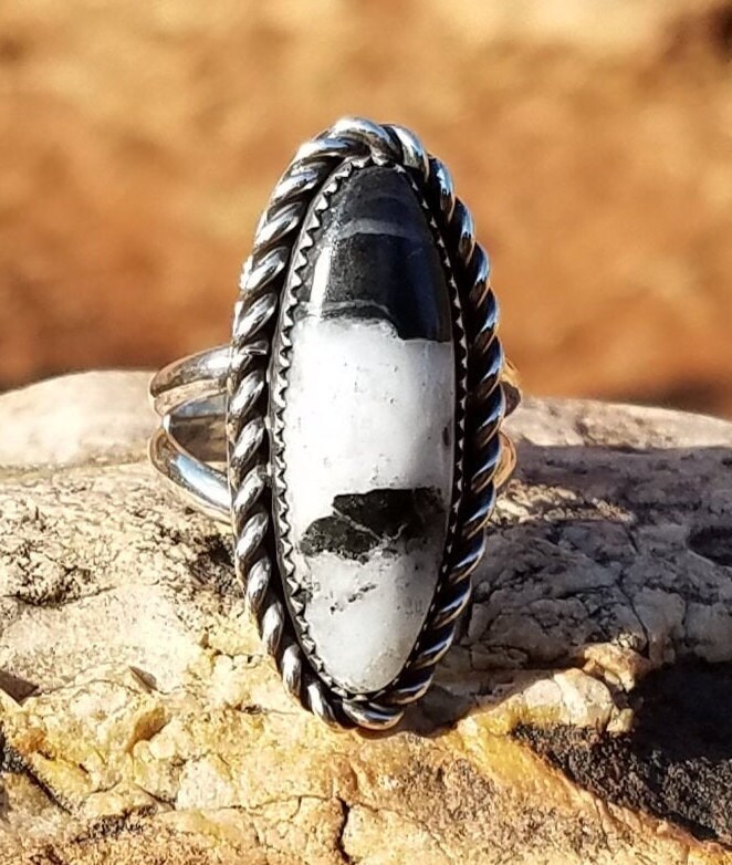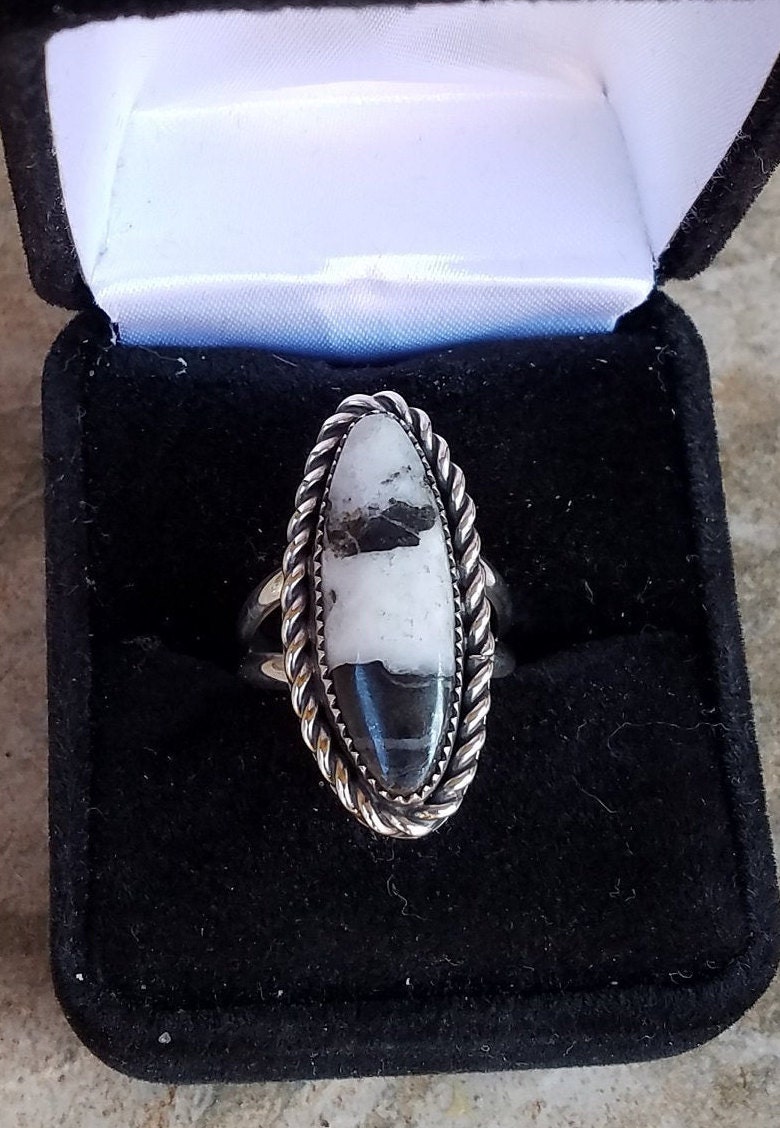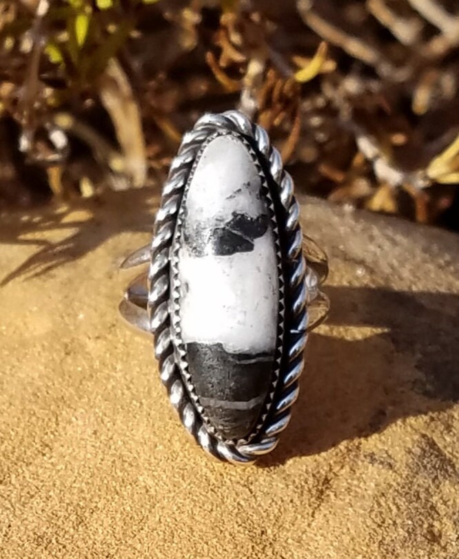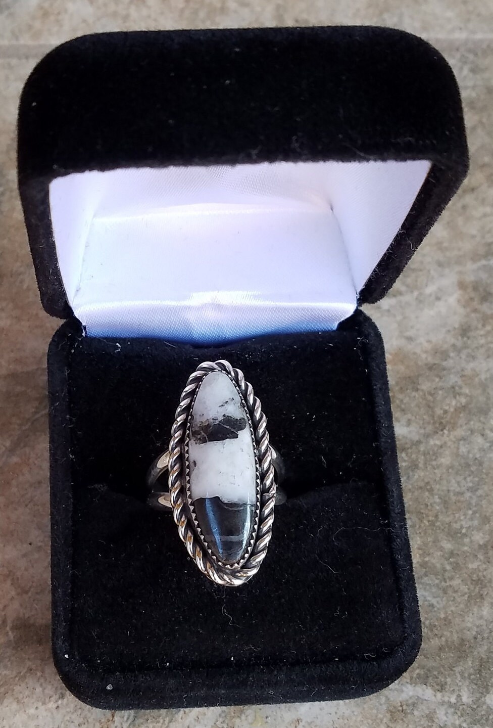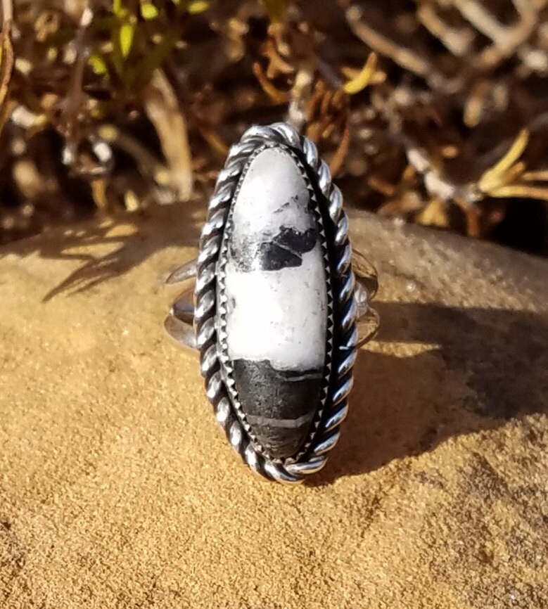 This ring is made with White Buffalo from Nevada, and set in all Sterling Silver 925. This is a Beautiful ring that can be worn and enjoyed for years to come, and it would make a wonderful gift for yourself or anyone who loves White Buffalo and Sterling Silver!